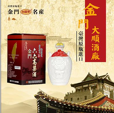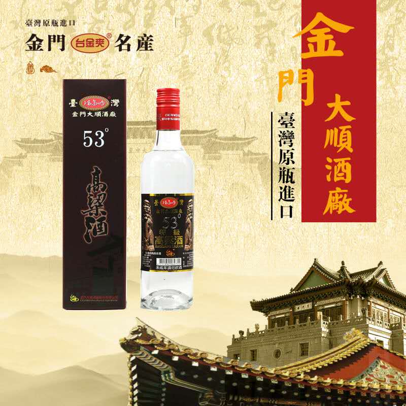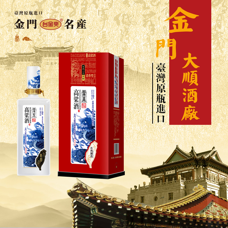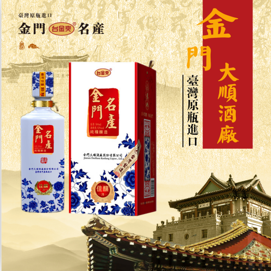 金門大順酒廠,座落于金門北緯24.5度,地處海隅,濱大陸,得天獨(dú)厚的地理,使它擁有絕佳的水質(zhì)、空氣、氣候及原料的四大天然釀酒條件。金門大順酒廠的高粱酒釀造是利用金門特產(chǎn)『旱地高粱』、引用當(dāng)?shù)厮|(zhì)甘甜的泉水、金門潔凈的空氣與氣候條件,并承襲傳統(tǒng)古法之釀酒技術(shù),加上獨(dú)家的釀酒專業(yè)技術(shù)經(jīng)驗(yàn)【三離二鍋一翻】的發(fā)酵釀酒工藝,經(jīng)掐頭去尾后入庫,去蕪存菁。而造就出金門大順酒廠的高粱酒特色「清澈透明、質(zhì)地純凈、芳香濃郁」之一系列高粱酒。金門大順酒廠制酒承襲著金門得天獨(dú)厚的地理環(huán)境,加上三代流傳之古法醇釀技技術(shù),結(jié)合經(jīng)驗(yàn)與現(xiàn)代化生產(chǎn),釀出風(fēng)味獨(dú)特,香、醇、甘、冽的【臺(tái)島】【臺(tái)金爽】【牛樟芝高粱酒】【龍騰鳳舞】【紅雙十】【陳高吶】【臺(tái)灣小酒】等多樣系列產(chǎn)品。真實(shí)原味、清香散發(fā),甘冽醇厚的絕佳風(fēng)味。